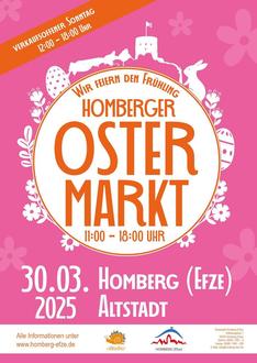 Die Blumen beginnen zu sprießen. Die Sonne scheint intensiver. Und schon steht Ostern vor der Tür. Der traditionelle Homberger Ostermarkt mit verkaufsoffenem Sonntag öffnet am Sonntag, dem 30. März 2025, in der Zeit von 11:00 bis 18:00 Uhr, seine Pforten. Auf dem Marktplatz in der historischen Homberger Altstadt hat ein Markt zu Ostern eine lange Tradition. Sie lebt auch in 2025 weiter und wird mit dem bunt dekorierten Ostermarkt gefeiert. Zahlreiche Stände laden dann mit Dekorations- und Geschenkideen zum Schauen und Kaufen ein. Die Gastronomen am und auf dem Marktplatz sorgen für ein reichhaltiges Angebot an regionalen Speisen und Getränken. Mit dem Ostermarkt begrüßt die Cittàslow Homberg (Efze) den Frühling. Ein Bummel mit der ganzen Familie durch die Altstadt und die geöffneten Geschäfte stimmen auf die warmen Jahreszeiten ein. Bei Live-Musik, Kaffee und Kuchen und leckeren regionalen Spezialitäten können sich unsere Gäste auf dem Homberger Marktplatz so richtig wohlfühlen. (di)