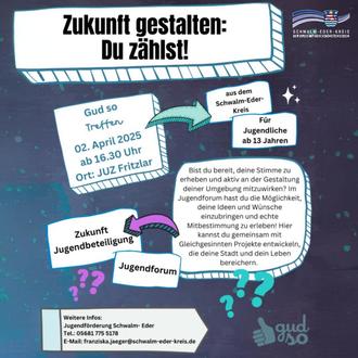 "Zukunft gestalten: Du zählst!" - so lautet das Motto am 2. April im Jugendzentrum Fritzlar. Das Jugendforum "Gud so" des Schwalm-Eder-Kreises lädt ab 16.30 Uhr zur Neugestaltung der Jugendbeteiligung ein. Teilnehmen können Jugendliche und junge Erwachsene von 13 bis 27 Jahren.