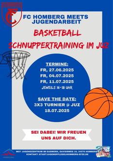 FC Homberg und städtische Jugendarbeit tun sich zusammen: In drei Schnuppertrainings sowie mit einem 3x3 Basketball-Turnier können Kinder und Jugendliche ab 10 Jahren auf dem Gelände des Jugendzentrums im Davidsweg 19 den Basketball-Sport mit dem Trainer-Team des FC Homberg ausprobieren.