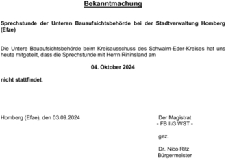 Die Untere Bauaufsichtsbehörde beim Kreisausschuss des Schwalm-Eder-Kreises hat uns heute mitgeteilt, dass die Sprechstunde mit Herrn Rininsland am