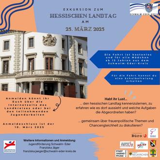 Am 25. März haben Mädchen ab 13 Jahren aus dem Schwalm-Eder-Kreis die große Gelegenheit, den Landtag in Wiesbaden zu besuchen und direkt mit Politikerinnen ins Gespräch zu kommen. Die Tagesfahrt bietet den Teilnehmerinnen die Chance, mehr über politische Prozesse zu erfahren und Einblicke in die Arbeit der Landespolitik zu gewinnen.