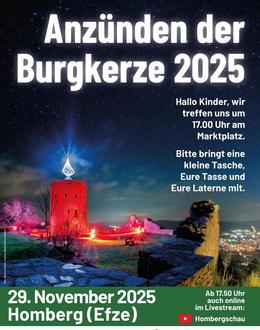 Das Anzünden der Burgkerze wird am Vorabend des ersten Advents für die kleinen und großen Kinder in und um Homberg (Efze) als besonderes Highlight gefeiert. In diesem Jahr wird die Kerze dank 30 fleißigen Homberger Spendern, der Burgberggemeinde, der Technischen Betriebe der Stadt Homberg und der kbg mit neuer Beleuchtung erstrahlen.