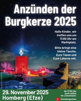 Das Anzünden der Burgkerze wird am Vorabend des ersten Advents für die kleinen und großen Kinder in und um Homberg (Efze) als besonderes Highlight gefeiert. In diesem Jahr wird die Kerze dank 30 fleißigen Homberger Spendern, der Burgberggemeinde, der Technischen Betriebe der Stadt Homberg und der kbg mit neuer Beleuchtung erstrahlen.