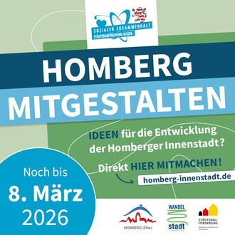 Wer an der Zukunftssession nicht teilnehmen kann, hat die Möglichkeit, sich online zu beteiligen: Bis zum 8. März 2026 ist unter www.homberg-innenstadt.de eine digitale Beteiligungskarte freigeschaltet. Dort können Interessierte Orte markieren und Anregungen hinterlassen oder eigene Ideen zur Entwicklung des Gebiets einbringen.