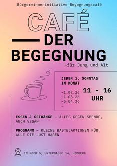 Jeden 1. Sonntag im Monat wird dort ein Raum geschaffen, in dem sich Menschen unvoreingenommen treffen, voneinander lernen und beisammen sein können. Zur Förderung des Austauschs und des gemeinsamen Miteinanders stehen Gesellschaftsspiele sowie ein Basteltisch mit verschiedenen Ideen zur Verfügung. Im Café gibt es außerdem Kaffee und Kuchen gegen Spenden, auch immer mit veganem Angebot. Alle dabei gesammelten Spenden werden an andere regionale und gemeinnützige Institutionen weitergegeben.
