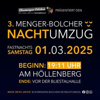 Am 1. März lädt der Dorfverein Bliesmengen-Bolchen bereits zum dritten Mal in Folge zu seinem beliebten Nachtumzug ein. Dazu können sich noch Gruppen anmelden. Anmeldungen bitte per E-Mail an anmeldung@menger-nachtumzug.de oder über das Anmeldeformular unter www.menger-nachtumzug.de/anmeldung.