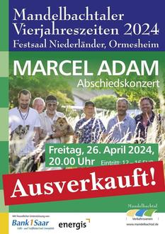 Zum zweiten Konzert der diesjährigen Mandelbachtaler Vierjahreszeiten kommt am 26. April mit Marcel Adam einer der bekanntesten Chansonniers und Liedermacher der Region zu uns in den Festsaal Niederländer. Das Konzert ist seit letzter Woche bereits vollkommen ausverkauft. Es gibt keine Eintrittskarten mehr.