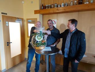 Der neue 1. Vorsitzende Christian Weis und 2. Vorsitzender Wolfgang Kohl bedankten sich bei Volker Steinfels für 20 Jahre als 1. Vorsitzender mit einem Präsentkorb.
