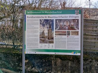 Auf dem kleinen Vorplatz der Rundturmkirche in Erfweiler-Ehlingen wurde die große Informationstafel, die dort schon fast 20 Jahre steht aber inzwischen stark verwittert und kaum noch lesbar war, vom Verkehrsverein Mandelbachtal entfernt und dafür eine völlig neue Objekttafel aufgestellt. Die neue Tafel wurden im Dezember 2024 vom Verkehrsverein Mandelbachtal in Zusammenarbeit mit der Werbeagentur Siffrin in Ommersheim im Rahmen des Projektes "Sehenswertes Mandelbachtal realisiert. Die Texte der Tafeln stammen von Manfred Pfeiffer, die visuelle Umsetzung von Friedbert Siffrin. Die aktuellen Bilder wurden von Steffen Jung fotografiert. Das Projekt "Sehenswertes Mandelbachtal" wurde finanziert vom Verkehrsverein Mandelbachtal und einer Zuwendung in Höhe von 80% von der Lokalen Aktionsgruppe Biosphärenreservat Bliesgau aus dem GAK-Regionalbudget. Dieses speist sich aus Bundesmitteln des Bundesministeriums für Ernährung und Landwirtschaft und aus Landesmitteln des Ministeriums für Umwelt, Klima, Mobilität, Agrar und Verbraucherschutz.
