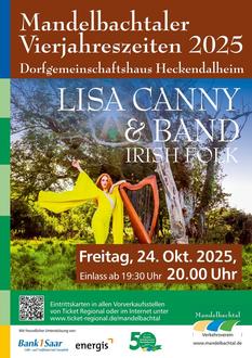 Eine gute Nachricht für die vielen Fans von Lisa Canny in unserer Region. Am Freitag, 24. Oktober, kommt die Ausnahmekünstlerin auf ihrer diesjährigen Deutschland-Tour nach zwei Jahren Pause nochmal mit ihrer Band für ein Konzert im Rahmen der Mandelbachtaler Vierjahreszeiten in unsere Gemeinde. Zwischen 2021 bis 2023 hatte die quierlige Irin bereits dreimal ihre stetig wachsende Fangemeinschaft im Bliesgau begeistert und dabei in Mandelbachtal stets für ausverkaufte Häuser gesorgt.