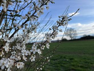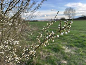 Allerorts fängt er an zu blühen und seine weißen Blüten sind im Mandelbachtal von weit her zu erkennen: der Weißdorn.