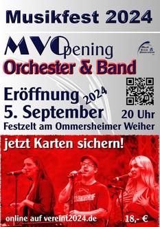 Das unvergessliche Musikfestwochenende findet vom 5. - 9. September 2024 im großen Festzelt am Ommersheimer Weiher statt. Unter dem Motto MVOpening startet der Musikverein Ommersheim am Donnerstag, den 5. September mit einem musikalischen Höhepunkt in das Musikfest 2024 und wird das Festzelt gemeinsam mit einer Live-Band und SängerInnen zum Beben bringen. Wer im Juni 2023 das SOMMER Open Air besucht hatte, kann mit Sicherheit ein Lied davon singen; wer nicht, wird ebenfalls begeistert sein, Gänsehaut garantiert.