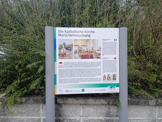 Die Texte der beiden Tafeln stammen von Manfred Pfeiffer, die visuelle Umsetzung von Friedbert Siffrin. Die schönen aktuellen Fotos stammen von Steffen Jung. Die Tafel informiert über die Geschichte der katholischen Kirche Mariä Heimsuchung in drei Sprachen: Deutsch, Englisch und Französisch. Die Katholische Kirche Mariä Heimsuchung nimmt in unserer Region eine besondere kunsthistorische Stellung ein und steht unter Denkmalschutz. Im Gegensatz zu den meisten anderen Kirchen in unserer Region weist die Kirche spätklassizistische Stilmerkmale auf.