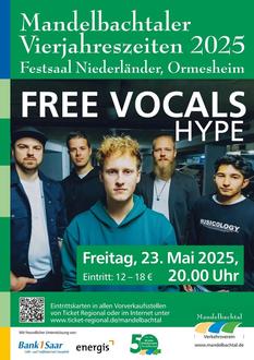 Zur Sommerveranstaltung der Mandelbachtaler Vierjahreszeiten kommt mit FREE VOCALS erstmals eine junge Band aus Regensburg mit ihrem neuen Programm HYPE am Freitag, 23. Mai, um 20:00 Uhr zu uns nach Mandelbachtal in den Festsaal Niederländer.
