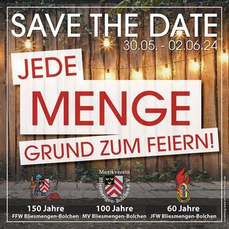 Vom 30. Mai bis zum 2. Juni 2024 gibt es im Golddorf Bliesmengen-Bolchen gleich drei Jubiläen zu feiern: Die Freiwillige Feuerwehr Bliesmengen-Bolchen feiert ihr 150-jähriges Bestehen, der Musikverein Bliesmengen-Bolchen blickt auf 100 Jahre zurück und die Jugendfeuerwehr Bliesmengen-Bolchen wird stolze 60 Jahre alt.