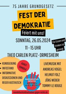Als weitere Antwort gegen Bestrebungen von Rechtsextremisten, die freiheitlich demokratische Grundordnung zu beseitigen, wird ein Fest für die Demokratie am Sonntag, den 26. Mai in Ormesheim vorbereitet.