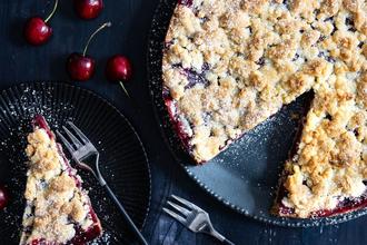 Für die Streusel, Butter, Zucker und Mehl zu krümeligen Streuseln kneten und über den Kirschen verteilen.