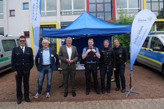 Landrat Dr. Theophil Gallo (3. v. l.) mit Reiner Hartz, Dienststellenleiter der Polizeiinspektion in Homburg (l.), sowie mit weiteren Polizistinnen und Polizisten aus Homburg und Saarbrücken.
