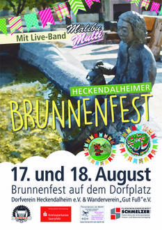 Am Samstag, 17. und Sonntag, 18. August veranstalten der Wanderverein „Gut Fuß“ und der Dorfverein Heckendalheim wieder das Brunnenfest auf dem Dorfplatz. Am Samstagabend spielt die Liveband Malibu Multi und es wird es ab 18.00 Uhr Grillwürste und Minutensteaks mit Pommes und einer vegetarischen Variante vom Grill geben. Am Sonntag zum Mittagessen gibt es Schwenker, Würstchen, Salat und Pommes. Am Nachmittag dann Kaffee und Kuchen. Dazu natürlich alle Arten von kalten Getränken und eine Cocktailbar.