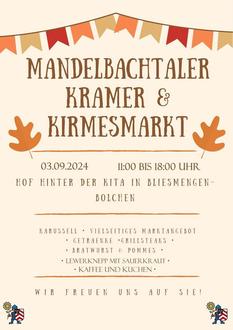Zu einem tradtionellen Mandelbachtaler Kramer- und Kirmesmarkt wird an der Kirb in Bliesmengen-Bolchen am Kirwedienstag, 3. September, von 11.00 bis 18.00 Uhr auf den alten Schulhof hinter der Kindertagesstätte eingeladen.