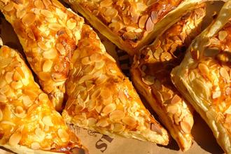 Je 1 EL Pudding und 1 EL Äpfel auf den Blätterteig geben und den Teig einschlagen. Die Ränder andrücken und mit Sahne und Eigelb bestreichen, wer mag, kann noch Mandelblättchen darüber streuen.