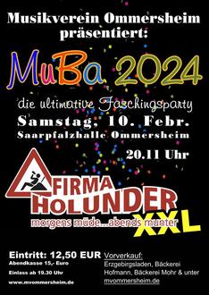 Auch dieses Jahr findet wieder traditionell an Faschingssamstag, 10. Februar ab 20.11 Uhr unser MuBa in der Saarpfalzhalle mit der Band „Firma Holunder“ statt. Der Eintritt kostet im Vorverkauf 12,50 Euro und an der Abendkasse 15 Euro. Der Kartenvorverkauf startete am 08. Januar im Mandelbachtaler Erzgebirgsladen als auch in den Bäckereien Mohr und Hofmann in Ommersheim. Karten können auch jederzeit online unter mvommersheim.de erworben werden.