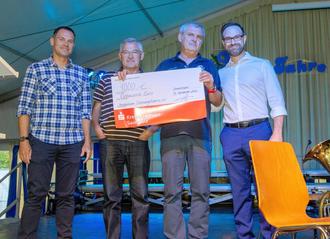 Vom 05. bis 09. September 2024 feierte der Musikverein Ommrsheim sein 95.jähriges Jubiläumsfest mit großem Festzelt und tollem, abwechslungsreichem Programm an der Naherholungsanlage Am Gangelbrunnen. Anstelle von Gastgeschenken wollte der rührige Verein in diesem Jahr lieber eine Spende an den gemeinnützigen Blieskasteler Schutzengelverein machen, um schwerstkranken und schwerstbehinderten Kindern in unserer Region zu helfen. In diesem Sinne wurde im Rahmen des Festaktprogramms am Freitagabend, 06.09.2024, der durch die Band "Saarblech" mit kleiner böhmischer Blechbläserbesetzung eröffnet wurde und mit Fassbieranstich sowie offiziellem Festakt erfolgte, die bemerkenswerte 1.000 Euro-Spendenübergabe an Vertreter des Schutzengelverein vorgenommen. Den Spendenscheck überreichten Francesco Fontana und André Hofmann vom Vorstand des Musikverein auf der großen Festbühne an Hubert Schewes und Peter Geble vom Schutzengelverein-Vorstand, die sich für die schöne Idee, die bemerkenswerte Geste sowie die tolle Spende herzlich bedankten.