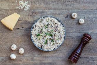 1. Pilze zunächst putzen und in Würfel schneiden, anschließend Zwiebel fein hacken.2. 1 EL Öl in einen Topf geben und Zwiebeln andünsten. Risotto-Reis unterrühren und anschwitzen. Dann mit Balsamico ablöschen.3. Soviel Gemüsebrühe zugeben, bis der Reis bedeckt ist. Bei mittlerer Hitze ca. 30 Minuten köcheln und nach und nach unter Rühren die restliche Brühe nachgießen. (Der Reis sollte immer mit Brühe bedeckt sein)4. Währenddessen restliches Öl in einer Pfanne erhitzen und die Pilze 5 Minuten anbraten.5. Risotto mit Salz, Pfeffer und Muskat abschmecken und Petersilie,