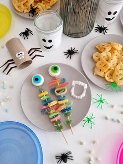 Gesunde Snacks: Für eine gesündere Option können Sie Obst in gruseligen Formen anbieten, z.B. Apfelspalten mit Erdnussbutter (als „Zähne“) oder Bananen, die wie Gespenster dekoriert sind.