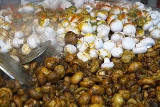 Die Zwiebeln schälen und achteln, die Champignons abbürsten und die Stiele abschneiden.