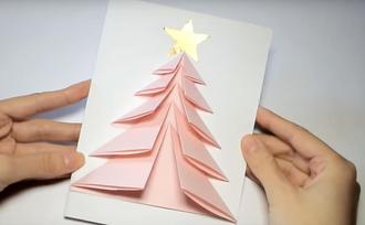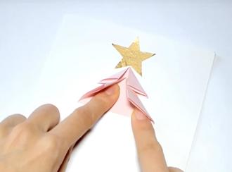 3. Nun noch einen Stern (oder was anderes) aus dem Goldpapier für die Baumspitze ausschneiden und die Dreiecke auf den Kartenkarton aufkleben. Am einfachsten ist es, an der Spitze anzufangen. Dann können die Spitzen überlappend auf die Dreiecke aufgeklebt werden.