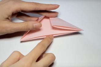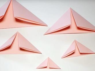 2. Im nächsten Step müssen die Quadrate gefaltet werden – erst mittig mit der offenen Seite nach unten zu einem Rechteck, dann die beiden äußeren Ecken nach unten falten, sodass ein nach unten geöffnetes Dreieck entsteht.