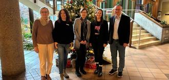 Bei der Spendenübergabe im Landratsamt (v. r.): Landrat Frank John, Johanna Kapp, Tanja Meiser, Kathrin Lenhard und Beate Ruffing, beide Mitarbeiterinnen der Presse- und Öffentlichkeitsarbeit.