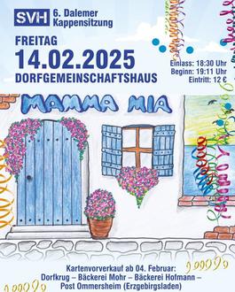 An Valentinstag, am Freitag, 14. Februar, findet um 19:11 Uhr die Dalemer Kappensitzung unter dem Motto "Mamma Mia" im Dorfgemeinschaftshaus in Heckendalheim statt.