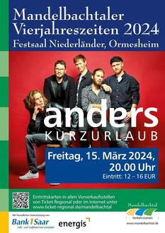Die Mandelbachtaler Vierjahreszeiten 2024 werden am Freitag, 15. März um 20.00 Uhr im Festsaal Niederländer in Ormesheim mit einem Konzert von ANDERS und damit mit einem echten Großkaliber der deutschen Livebands eröffnet.