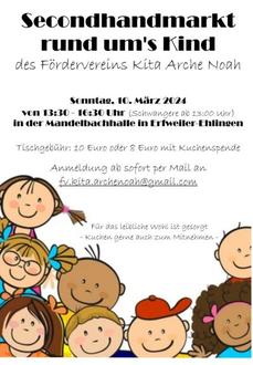 Der Förderverein der Kita Arche Noah lädt am 10.03.2024 zum Secondhandmarkt rund ums Kind ein. Dieser findet in der Mandelbachhalle in Erfweiler-Ehlingen von 13:30 bis 16:30 Uhr statt. Schwangere können bereits ab 13:00 Uhr den Markt besuchen und stöbern.