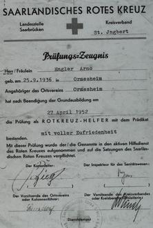 Er sagte mir, dass er in Ormesheim wieder eine DRK-Ortsgruppe aufbauen wolle und Leute sucht, welche da mitmachen wollen. Da kam mir in den Sinn, dass er im November 1945 meinen Vater, meiner Mutter und mir dadurch das Leben rettete, weil er, im Gegensatz zu der in Ormesheim tätigen Ärztin Dr. …. (Sie hatte auf Lungenentzündung behandelt!) laut Aussage des damals im Krankenhaus Ensheim tätigen Arztes, Dr. Knappstein, die Krankheit erkannt hatte, an der wir litten, nämlich Typhus. Dies bestätigte ein Chefarzt des St. Ingberter Kreiskrankenhauses, Dr. Hecktor.
