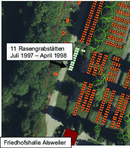 Für 11 Rasengrabstätten aus dem Belegungszeitraum von Juli 1997 bis April 1998 ist die Einebnung ab Mai 2023 vorgesehen.