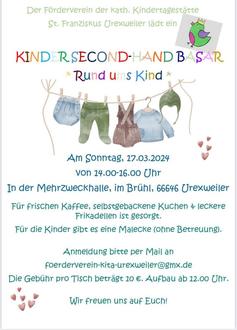 Der Secondhand-Markt findet nun bereits seit einigen Jahren in Urexweiler statt und hat sich zwischenzeitlich etabliert. Ich würde mich freuen, wenn wieder zahlreiche interessierte Eltern und Mitbürgerinnen und Mitbürger den Weg in unsere Mehrzweckhalle finden würden.
