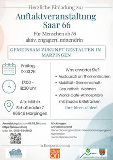 Etwas Neues gibt es auch für alle, die sich bereits in ihrer zweiten Lebenshälfte befinden. Speziell für sie wurde das Projekt Saar 66 konzipiert, das Menschen ab 55 Jahren zusammenbringt, die sich mit ihren Ideen für die Gemeinschaft engagieren wollen. Eine erste Veranstaltung hierzu findet am Freitag, dem 13.3.26, in der Alten Mühle in Marpingen statt.