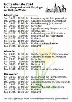 | MARP | 10:30 | Palmweihe u. Palmprozession z. Kirche, anschl. Hochamt, Leb. u. Verst. d. Pfarreiengemeinschaft, Josef Hubertus u. Maria geb. Schömer, Josef u. Elisabeth Recktenwald, Hannelore Buchholz, August u. Maria Blasius |
