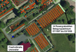 Für 14 Rasengrabstätten aus dem Belegungszeitraum von Juli 1997 bis März 1998 ist die Einebnung ab Mai 2023 vorgesehen.