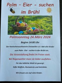 Die Osterzeit beginnt in Urexweiler mit zwei etablierten Veranstaltungen am Wochenende vor Ostern – am Palmwochenende. Traditionell lädt am Palmsonntag unser örtlicher Kaninchenzuchtverein zum Palmeiersuchen in den Brühl ein – so auch wieder dieses Jahr. Los geht es um 14:00 Uhr vor unserem Vereinsraum im Brühl – seid rechtzeitig da, damit alle Kinder in den Genuss des Eiersuchens kommen. Für das leibliche Wohl ist gesorgt. So gibt es leckere süße Waffeln, Rostwürste und Getränke. Ein Hinweis sei erlaubt: Die Veranstaltung findet nur bei gutem Wetter statt. Bei Regenwetter fällt diese leider aus.