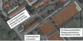Für 20 Rasengrabstätten aus dem Belegungszeitraum von April 1998 bis März 1999 und für 15 Einzelgrabstätten mit strenger Gestaltung aus dem Belegungszeitraum von Oktober 1997 bis März 1999 ist die Einebnung ab Mai 2024 vorgesehen.
