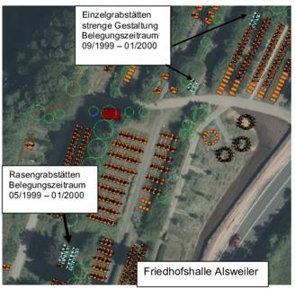 Für 11 Rasengrabstätten aus dem Belegungszeitraum von Mai 1999 bis Januar 2000 und für 7 Einzelgrabstätten aus dem Belegungszeitraum von September 1999 bis Januar 2000 ist die Einebnung ab Juli 2025 vorgesehen.