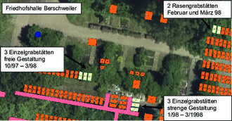 Somit ist eine Einebnung ab Juli 2023 für 3 Einzelgrabstätten mit strenger Gestaltung und 3 Einzelgrabstätten freier Gestaltung aus dem Belegungszeitraum Oktober 1997 bis März 1998 und für 2 Rasengrabstätten aus dem Belegungszeitraum Februar und März 1998 vorgesehen.