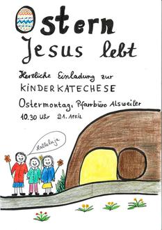 Nach der Messe mit Kinderkatechese am Ostermontag laden die Alsweiler Messdiener die Kinder zu Ostereiersuche am Pfarrheim ein.