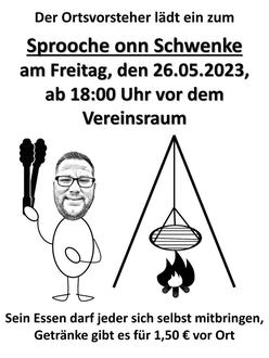 Zu einer weiteren tollen Veranstaltung, die am kommenden Freitag stattfindet, darf ich Euch ebenfalls herzlich einladen. Am 26. Mai 2023 findet das nächste Sprooche onn Schwenke statt. Los geht es ab 18 Uhr vor dem Vereinsraum.