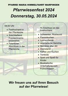Im Anschluss an das Festamt und die Prozession am Fronleichnamsfest am Donnerstag, 30. Mai 2024, findet auch in diesem Jahr wieder das traditionelle Pfarrwiesenfest statt, zu dessen Gelingen wieder viele Helfer*innen, aber auch viele Kuchenspenden benötigt werden. Wir freuen uns sehr, wenn sich viele Kuchenbäcker*innen auf unserer Liste, die seit Anfang der Woche in der Pfarrkirche ausliegt, eintragen und einen Kuchen backen.