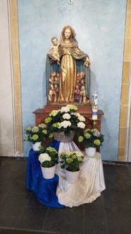 unser schön geschmückter Maialtar vor der Schutzmantel Madonna, als optischer Mittelpunkt für die Maiandachten zu Ehren der heiligen Gottesmutter Maria. Die Kosten für den Blumenschmuck hat die kfd Marpingen übernommen. Ein herzliches Dankeschön dafür!